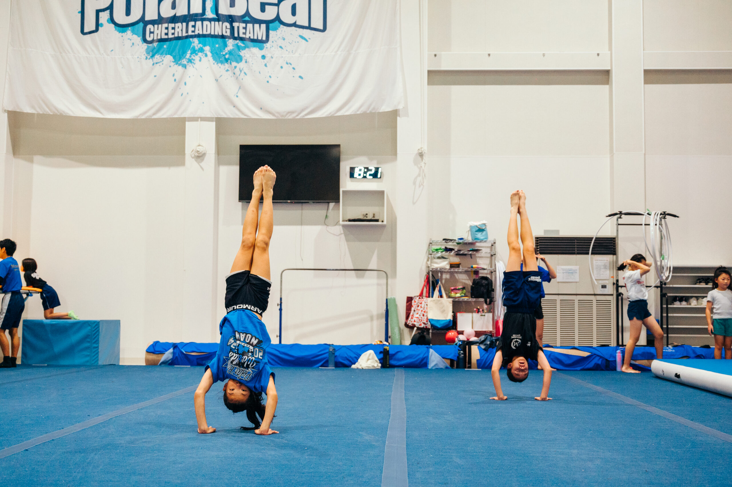 小1〜チアリーディング式タンブリング講座です。体操競技、チアリーディング経験者の先生による指導で、技練習だけでなく、基礎から技に繋がるトレーニングを行い、青マットでキレイな実施が出来ることを目的とします。