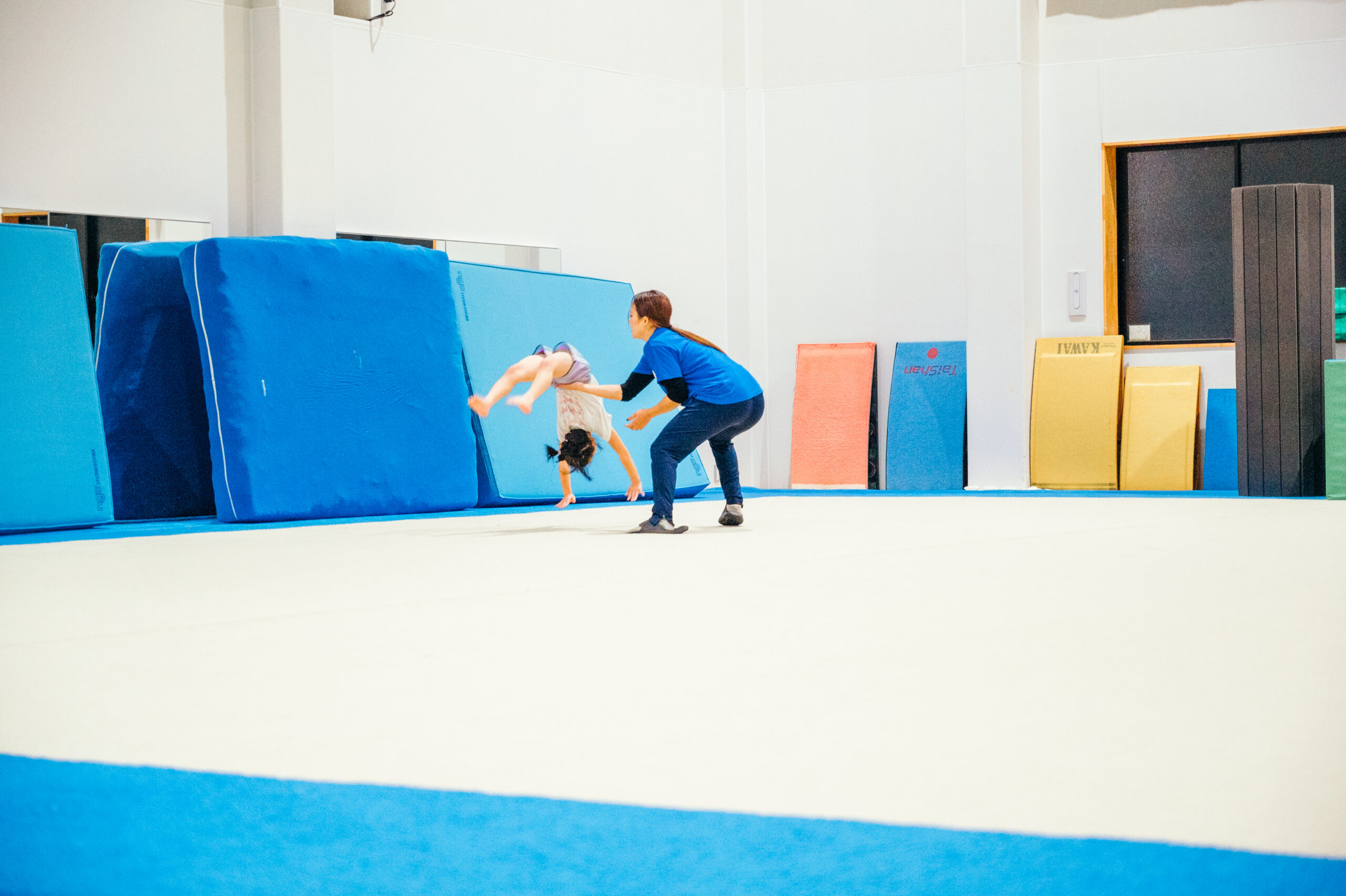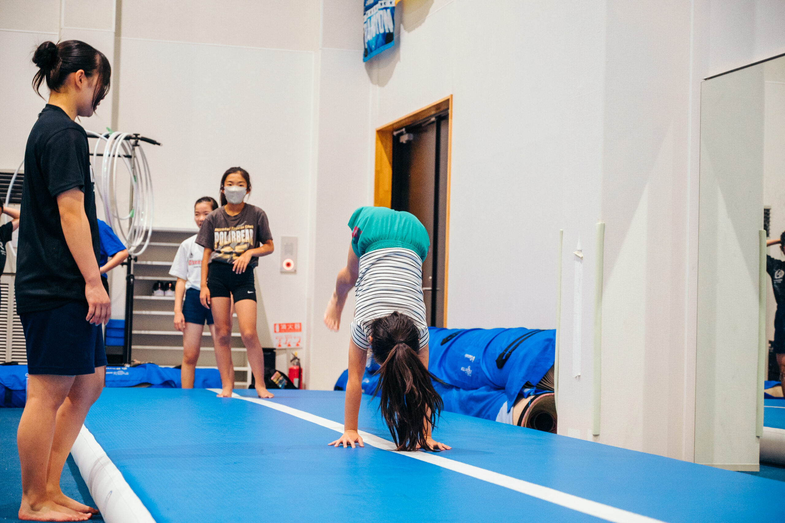 バク転・ロンダートなどのアクロバット技は、正しいフォームと適切な補助が欠かせません。