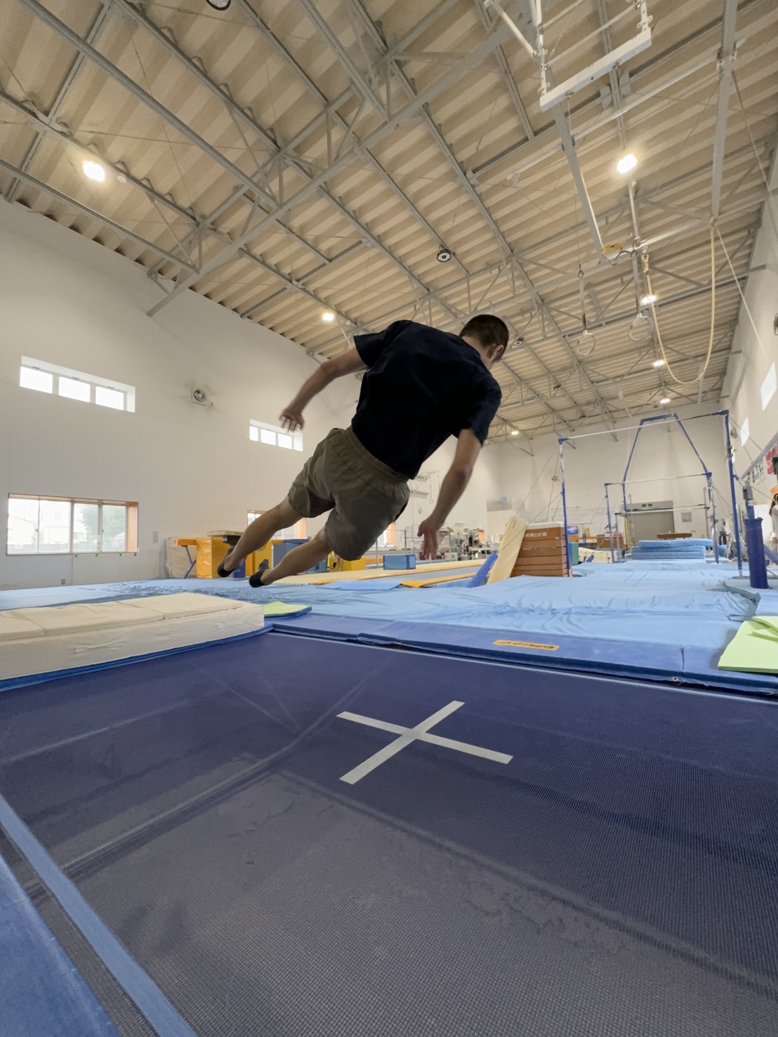 基本的なジャンプから開脚、ひねりといった空中で姿勢を変える跳び方にも挑戦します。武蔵新城のトランポリンクラスでは腹落ちや背落ちといった跳び方にも挑戦します。