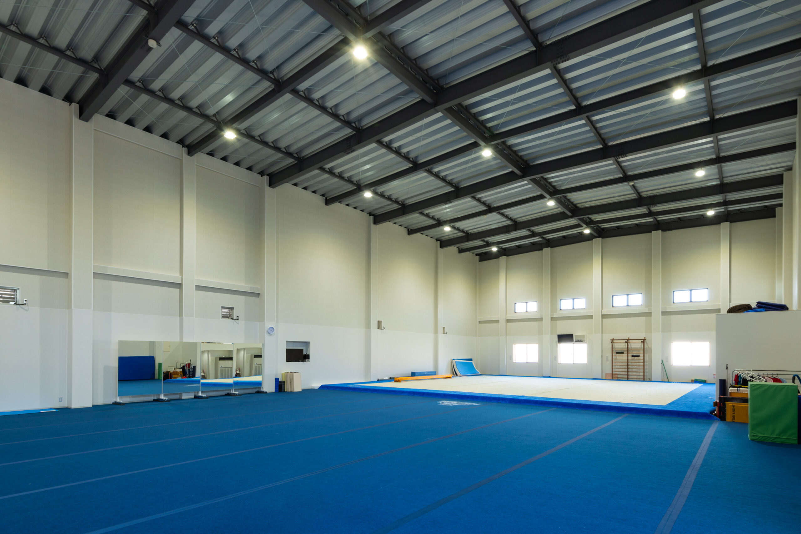 1号館に隣接した第2施設として、体操床フロア、新体操マット、チアリーディングマット9枚、競技用トランポリンを完備しております。