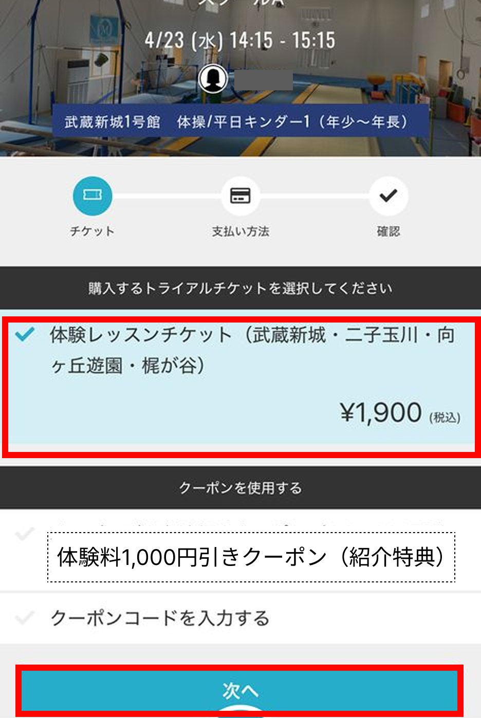 「体験レッスンチケット」を選択し、「次へ」をクリック。