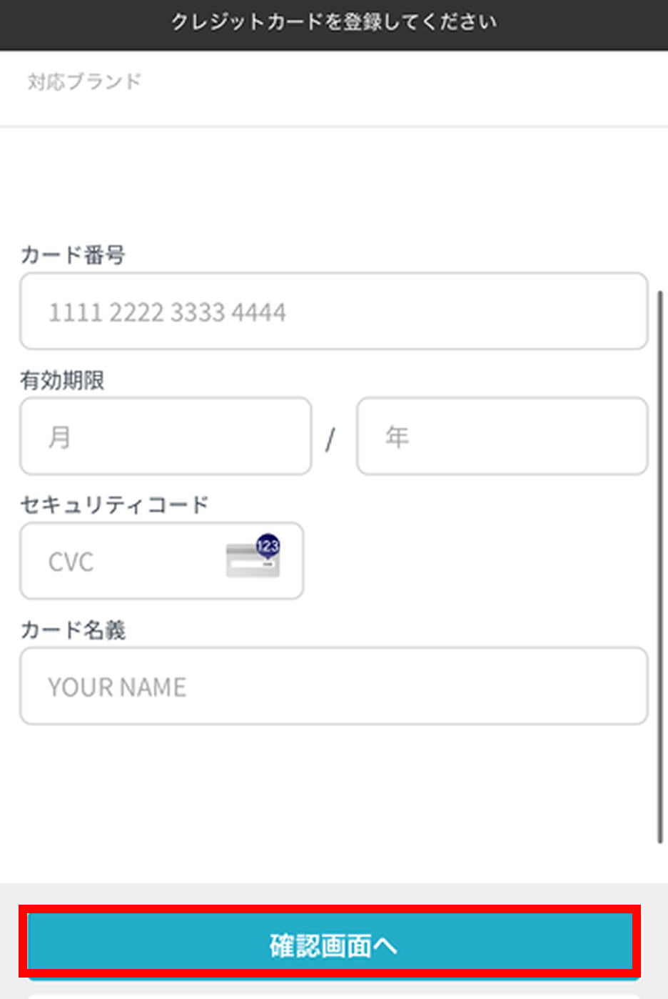 カード情報を入力し、「確認画面へ」→「申し込み」ボタンをクリック。