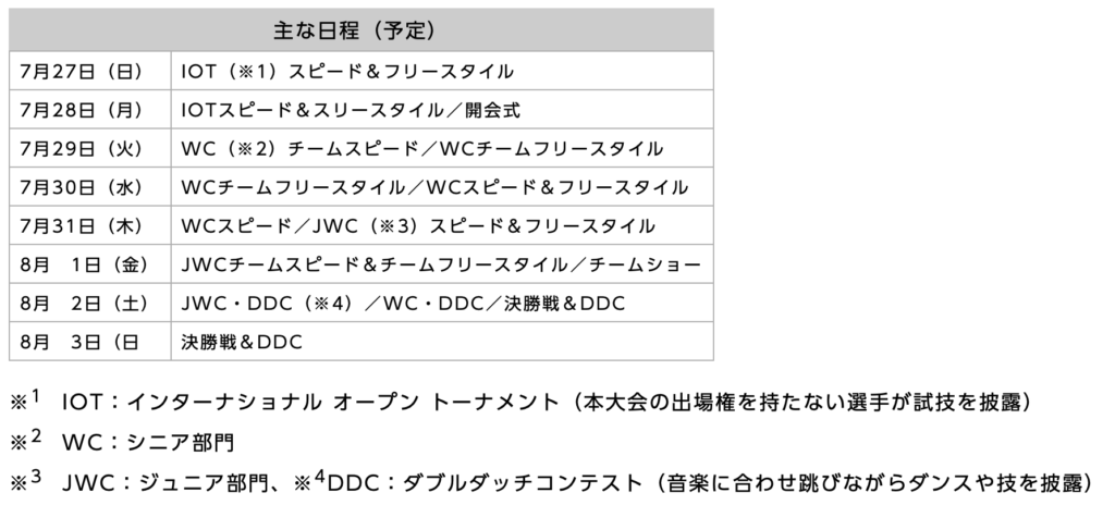 大会では、スピード感あふれる競技部門や、音楽に合わせたダイナミックでアクロバティックな技で、観客を魅了するダブルダッチのコンテスト部門などの各種目で世界最高峰の技術を持った選手達がによる熱い戦いが、川崎の地で繰り広げられます。